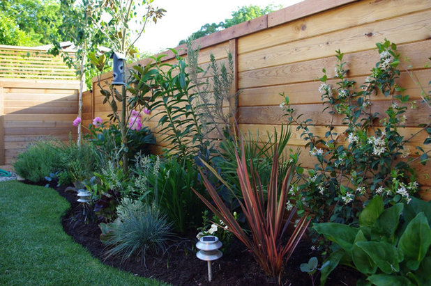 How do you design a backyard to 2 toddler boys and their parents who is safe, engaging, and attractive? Here, Creo Landscape Architecture More than fulfilled the challenge in this San Francisco area home that includes dining and seating spaces alongside a grass-covered berm and vibrant sculptures to the children.The fence and seat are made of redwood--the fence includes a mild stain while the bench is natural and Podocarpus (plum pines) were planted to give greenery and enhance privacy. Invites the boys to roll, tumble, and enjoy their backyard. Durable bluegrass is implanted on the flat regions of the lawn, and also recycled brick is employed for a little terrace. To create smart use of this room, the redwood benches have storage room to store outdoor toys when they're not in use.